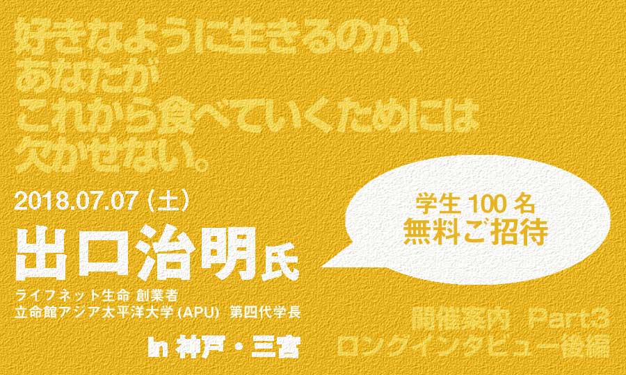 ぜひ7月7日、神戸での120分間、出口さんの“生の言葉”を、漏らさず聞いてみてください。あなたの人生が、きっと、よりシンプルに、力強くなります。そう、どうせだったら、好きなように生きていこうぜ!