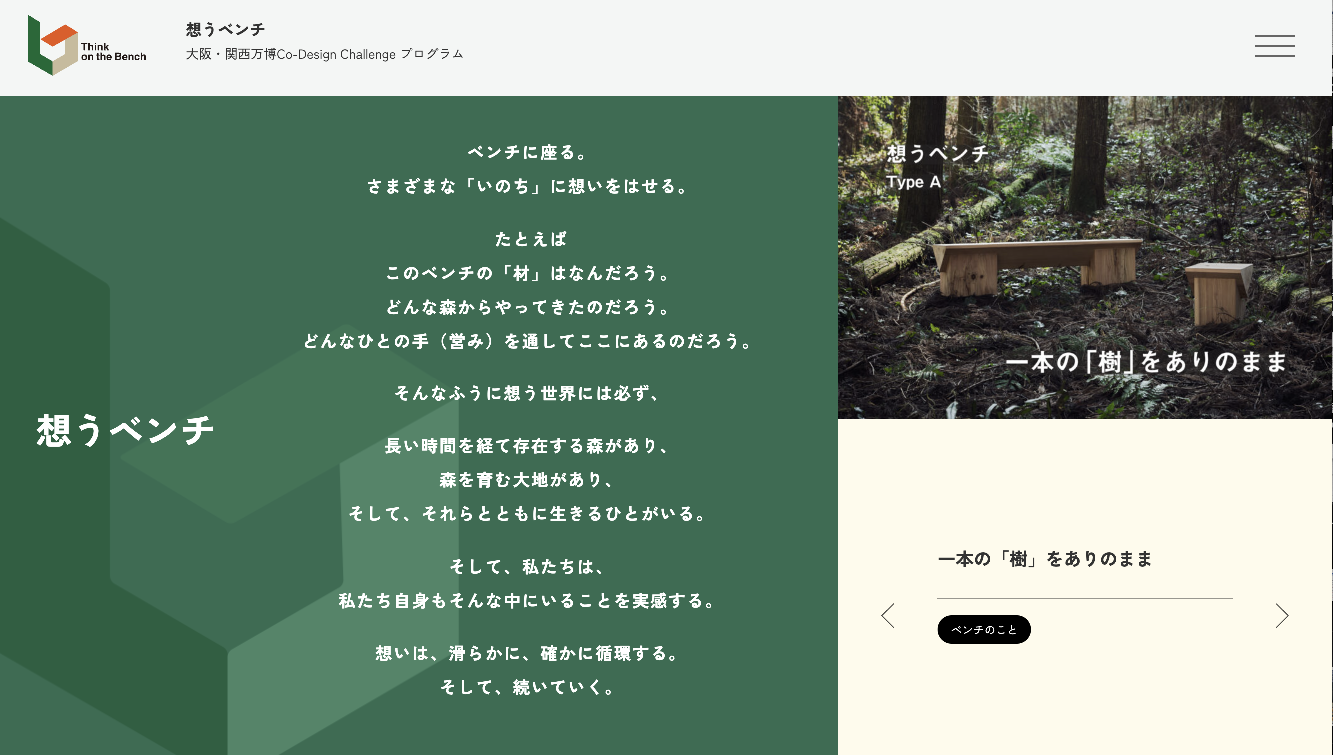 大阪府との包括連携協定に基づく「大阪 森の循環促進プロジェクト」の一環として、大阪産木材を活用したベンチを製作して、大阪・関西万博へ参加。そんな仕組みからスタートしたプロジェクトの運営支援として参画しました。弊社が提案したのは、ベンチを作るだけではなく、ベンチ製作をきっかけとし、多様なひとが共に「いのちの循環」に思いを馳せるきっかけを作ること。“with Local”を掲げる同社の理念に基づき、大阪や地域のみなさまと一緒に取り組むプロジェクトに発展しました。木材を使ったワークショップの開催や公募で集まった府民ライターによる日々の暮らしの中で感じる「いのち」をテーマとした記事制作など、大阪府民のみなさまや林業関係者をはじめとする多様な事業者とともにプロジェクトを作り上げ、豊かな接点を生み出しました。